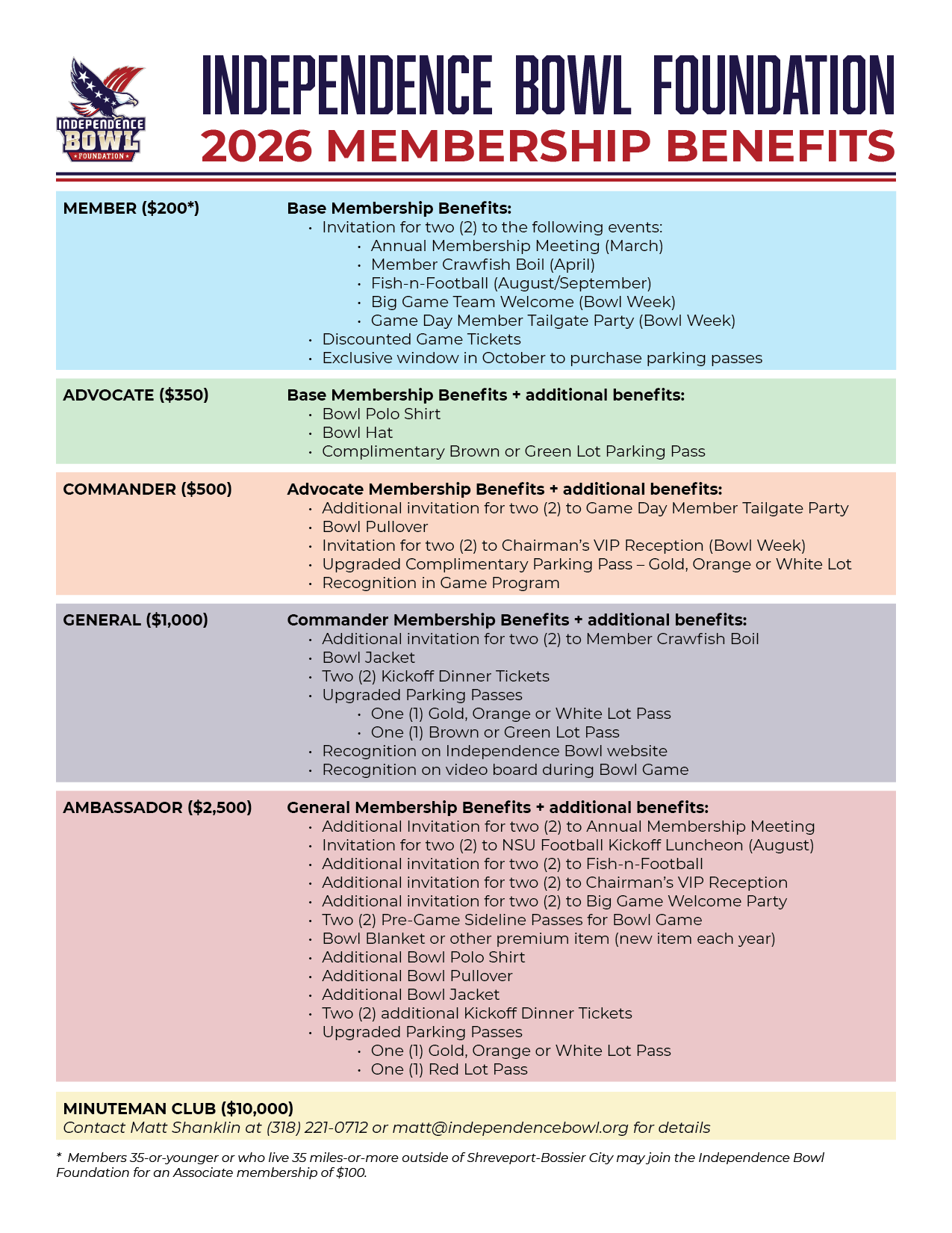 Join the Independence Bowl Foundation today! Today’s members and volunteers are tomorrow’s Independence Bowl leadership team!