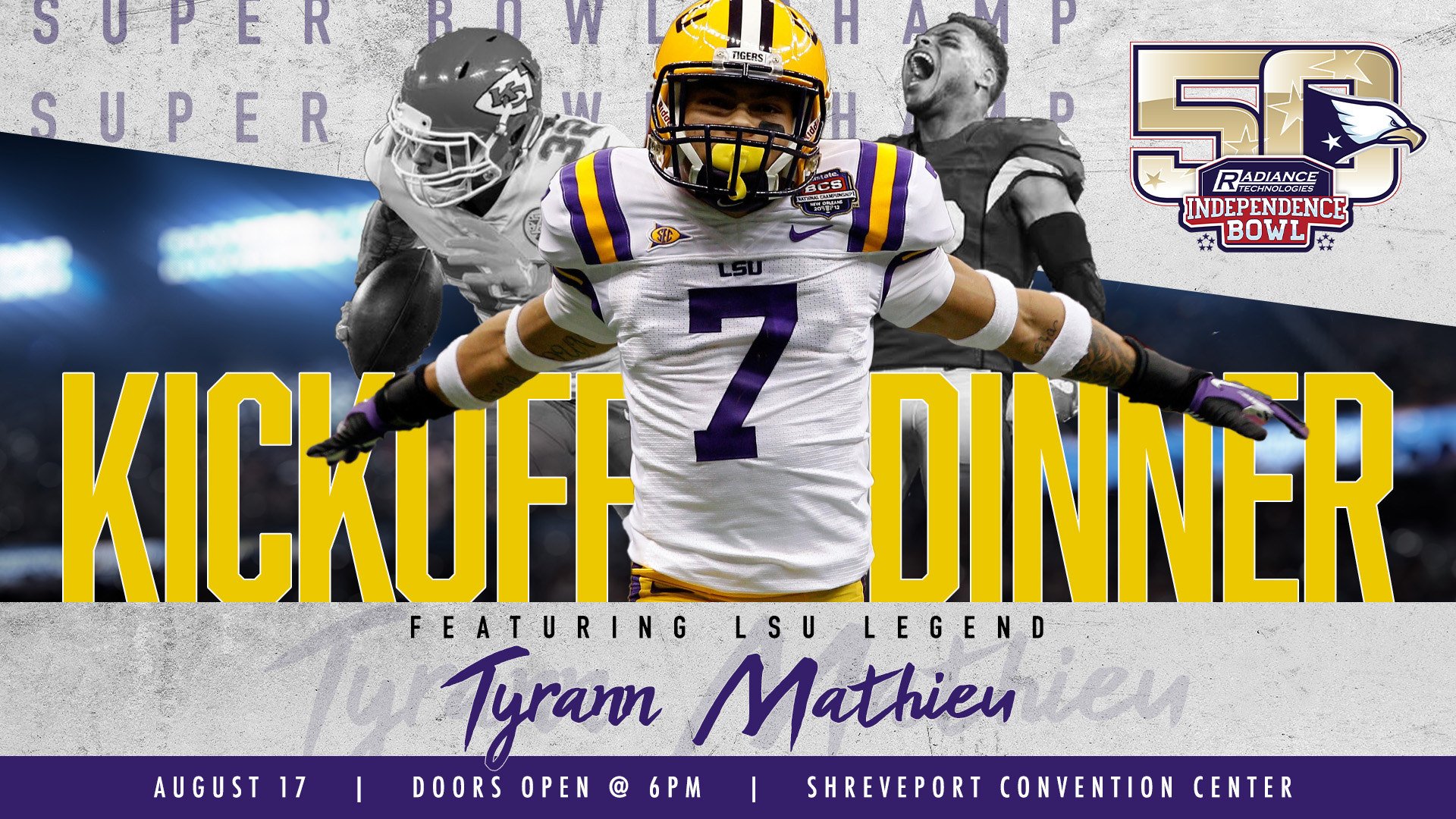 The Radiance Technologies Independence Bowl routinely features some of collegiate sports’ greatest players and coaches to help kick off the college football season at the annual Radiance Technologies Independence Bowl Kickoff Dinner, and 2026’s version of the event will welcome former LSU great and Super Bowl champion, Tyrann Mathieu, as the featured speaker on Monday, August 17.